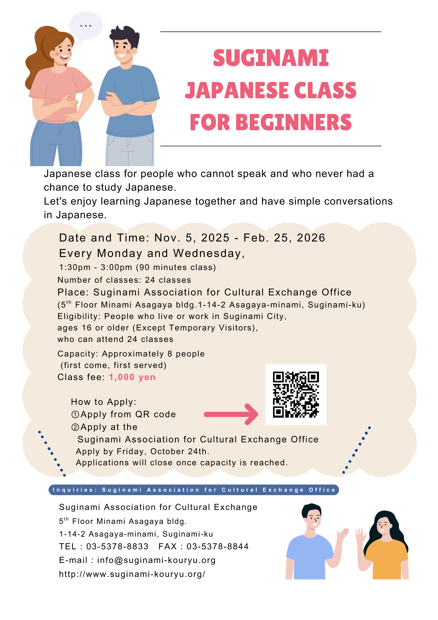 以下のQRコードから申し込むか、杉並区交流協会の窓口で申し込んでください。