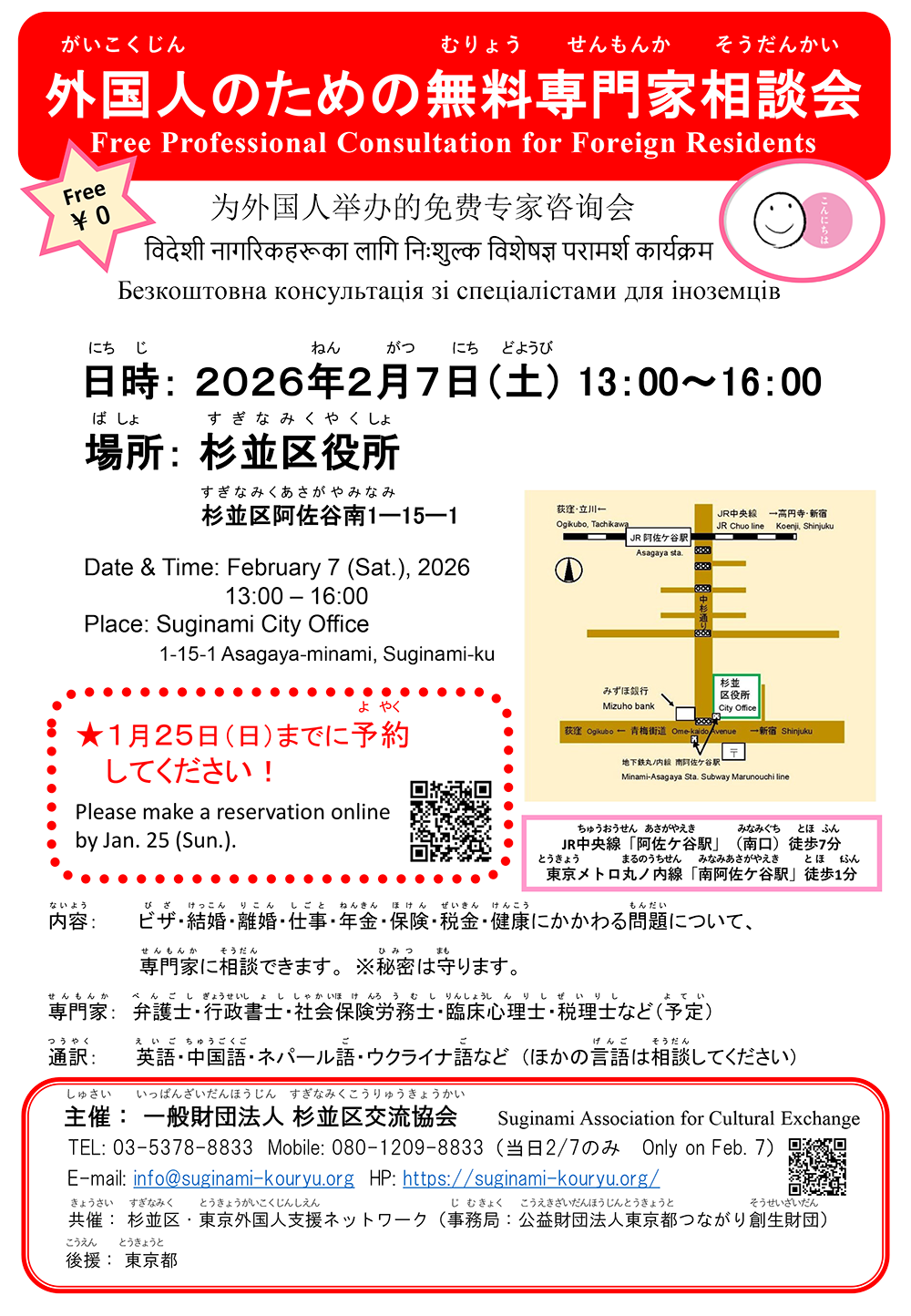 ビザ、結婚(けっこん)、離婚(りこん)、仕事(しごと)、保険(ほけん)、税金(ぜいきん)などの問題(もんだい)について、弁護士(べんごし)などの専門家(せんもんか)に無料(むりょう)で相談(そうだん)できます。通訳(つうやく)がいます。1月(がつ)25日(にち)までに予約(よやく)してください。
