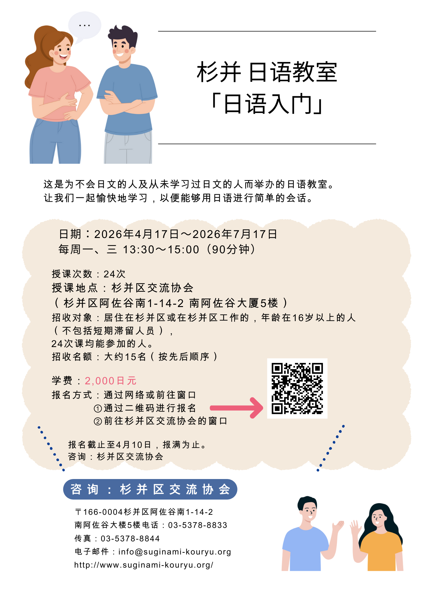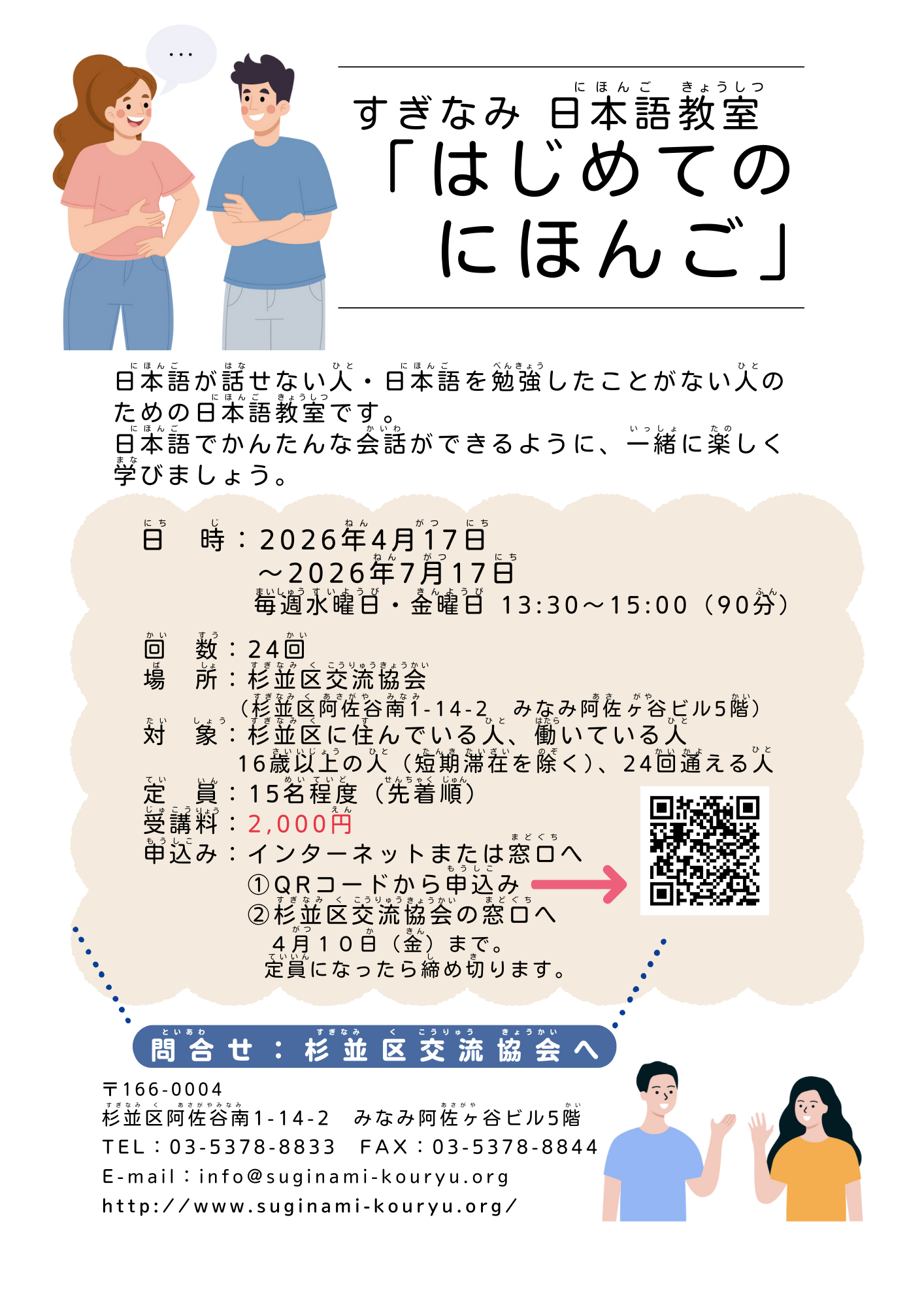 以下のQRコードから申し込むか、杉並区交流協会の窓口で申し込んでください。